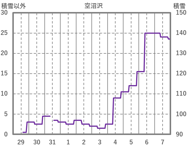| 日 | 時 | 気温 | 降水 | 風向/風速 | 日照 | 積雪 | 降雪 |