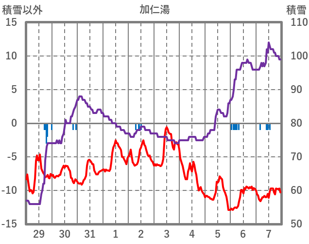 | 日 | 時 | 気温 | 降水 | 風向/風速 | 日照 | 積雪 | 降雪 |