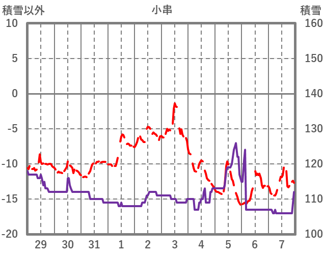 | 日 | 時 | 気温 | 降水 | 風向/風速 | 日照 | 積雪 | 降雪 |