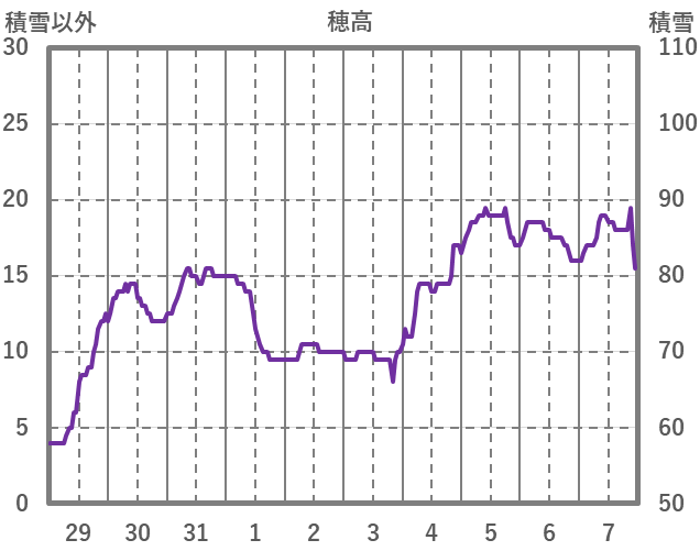 | 日 | 時 | 気温 | 降水 | 風向/風速 | 日照 | 積雪 | 降雪 |