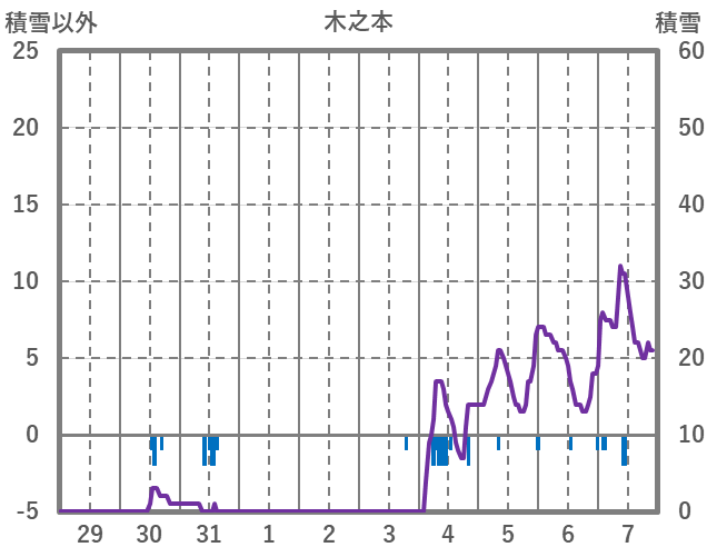 | 日 | 時 | 気温 | 降水 | 風向/風速 | 日照 | 積雪 | 降雪 |