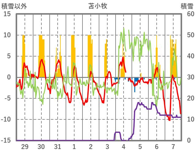 | 日 | 時 | 気温 | 降水 | 風向/風速 | 日照 | 積雪 | 降雪 |