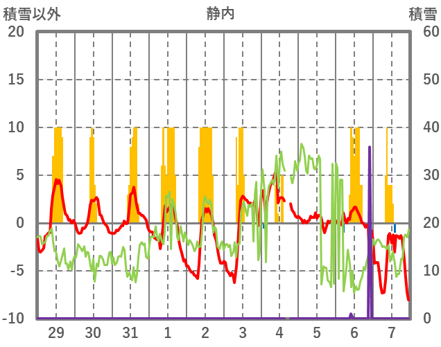 | 日 | 時 | 気温 | 降水 | 風向/風速 | 日照 | 積雪 | 降雪 |