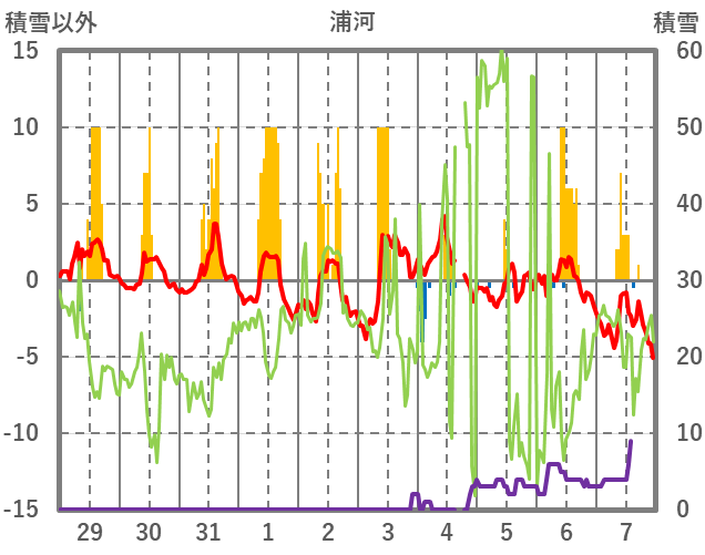 | 日 | 時 | 気温 | 降水 | 風向/風速 | 日照 | 積雪 | 降雪 |