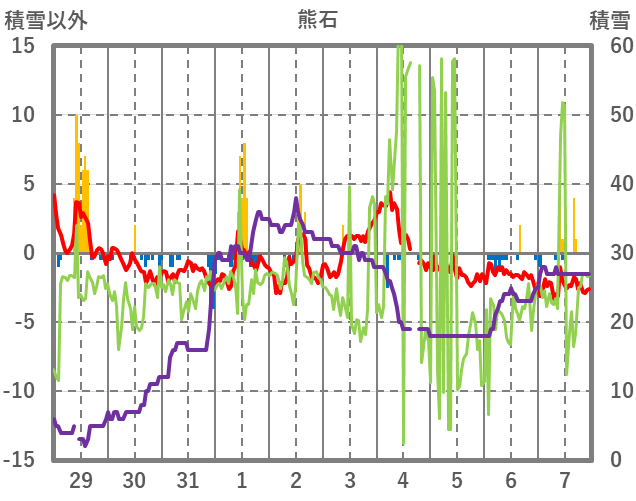 | 日 | 時 | 気温 | 降水 | 風向/風速 | 日照 | 積雪 | 降雪 |