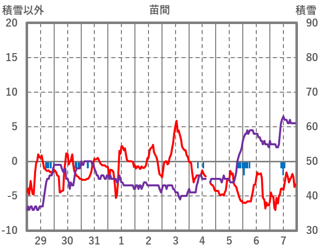 | 日 | 時 | 気温 | 降水 | 風向/風速 | 日照 | 積雪 | 降雪 |