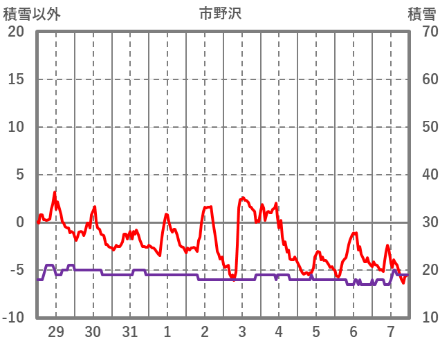 | 日 | 時 | 気温 | 降水 | 風向/風速 | 日照 | 積雪 | 降雪 |