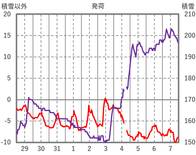 | 日 | 時 | 気温 | 降水 | 風向/風速 | 日照 | 積雪 | 降雪 |