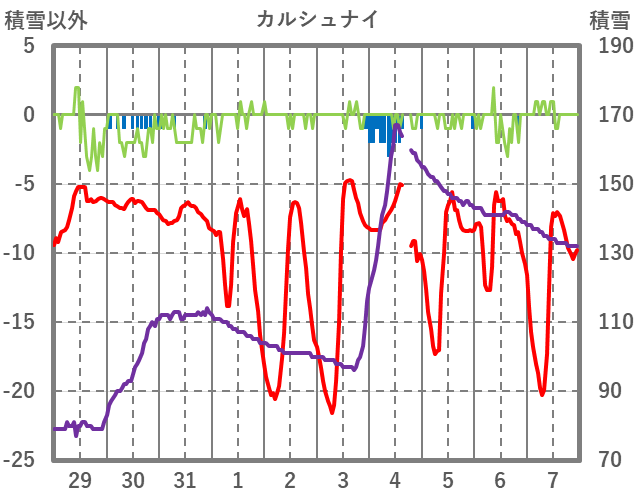 | 日 | 時 | 気温 | 降水 | 風向/風速 | 日照 | 積雪 | 降雪 |