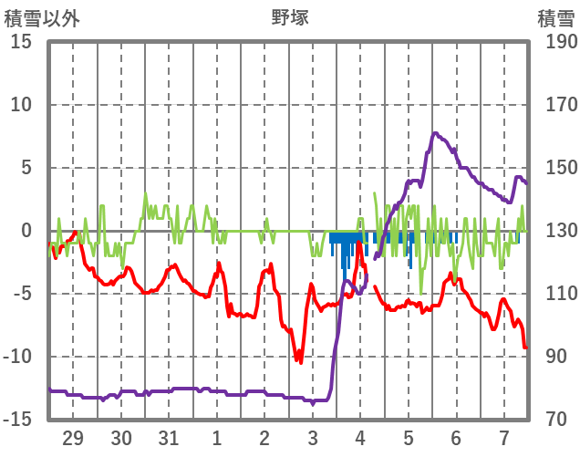 | 日 | 時 | 気温 | 降水 | 風向/風速 | 日照 | 積雪 | 降雪 |