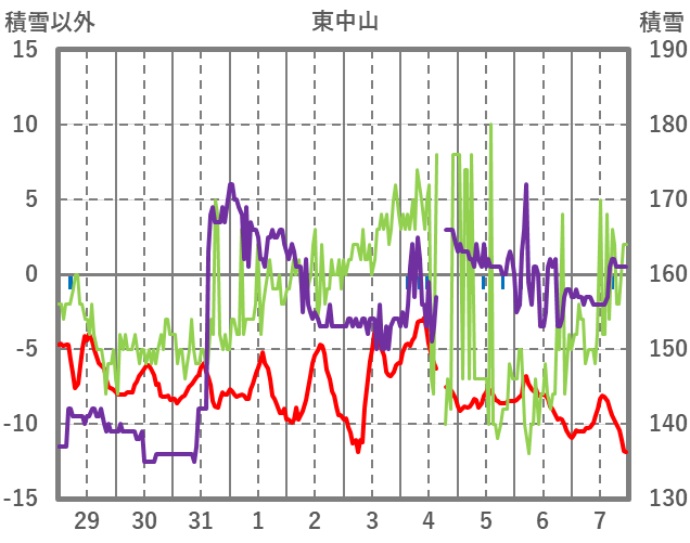 | 日 | 時 | 気温 | 降水 | 風向/風速 | 日照 | 積雪 | 降雪 |