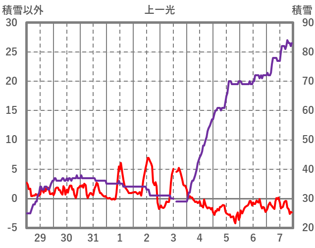 | 日 | 時 | 気温 | 降水 | 風向/風速 | 日照 | 積雪 | 降雪 |