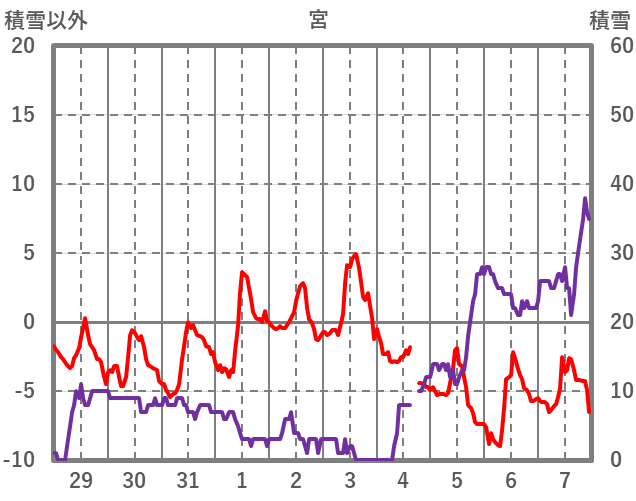 | 日 | 時 | 気温 | 降水 | 風向/風速 | 日照 | 積雪 | 降雪 |