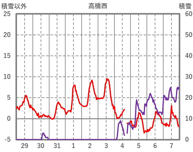 | 日 | 時 | 気温 | 降水 | 風向/風速 | 日照 | 積雪 | 降雪 |