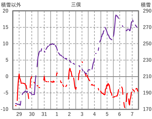 | 日 | 時 | 気温 | 降水 | 風向/風速 | 日照 | 積雪 | 降雪 |