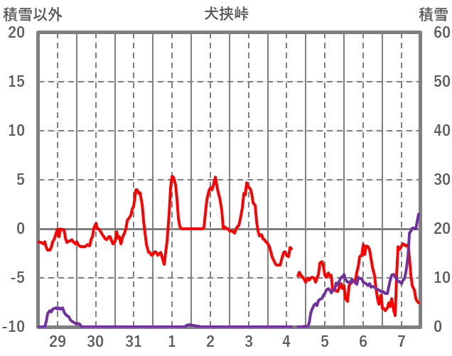 | 日 | 時 | 気温 | 降水 | 風向/風速 | 日照 | 積雪 | 降雪 |