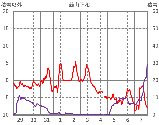 | 日 | 時 | 気温 | 降水 | 風向/風速 | 日照 | 積雪 | 降雪 |