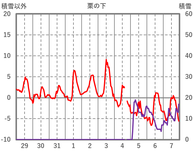 | 日 | 時 | 気温 | 降水 | 風向/風速 | 日照 | 積雪 | 降雪 |
