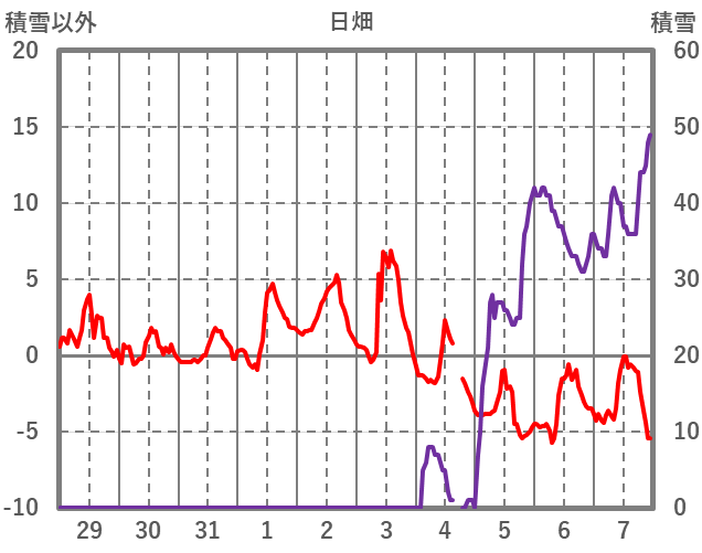 | 日 | 時 | 気温 | 降水 | 風向/風速 | 日照 | 積雪 | 降雪 |