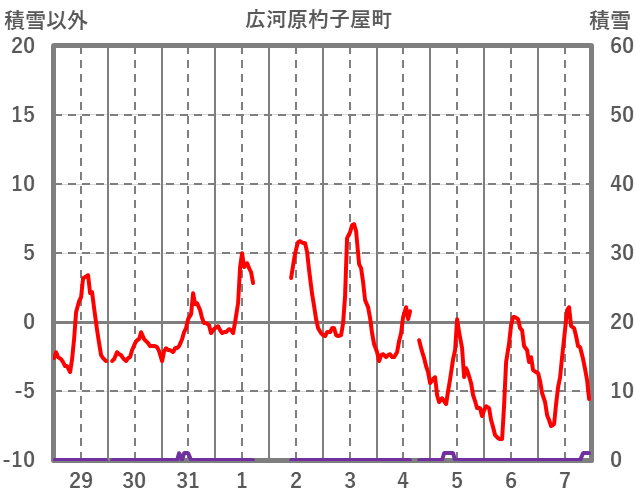 | 日 | 時 | 気温 | 降水 | 風向/風速 | 日照 | 積雪 | 降雪 |