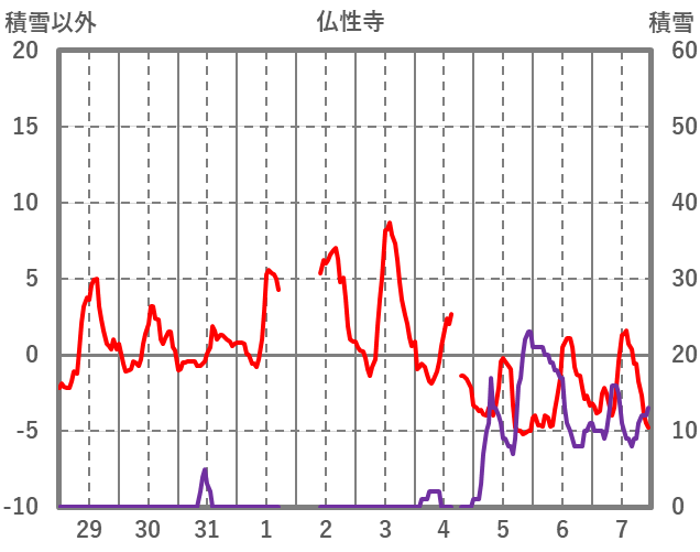 | 日 | 時 | 気温 | 降水 | 風向/風速 | 日照 | 積雪 | 降雪 |