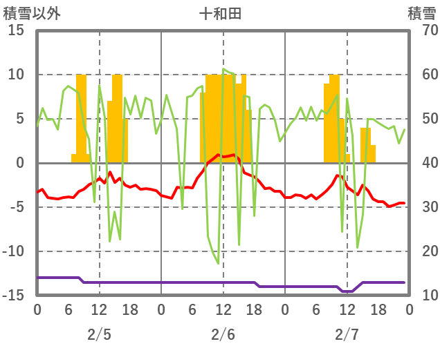 | 日 | 時 | 気温 | 降水 | 風向/風速 | 日照 | 積雪 | 降雪 |