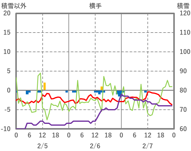 | 日 | 時 | 気温 | 降水 | 風向/風速 | 日照 | 積雪 | 降雪 |