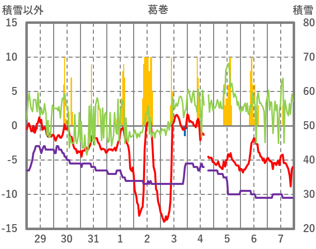 | 日 | 時 | 気温 | 降水 | 風向/風速 | 日照 | 積雪 | 降雪 |