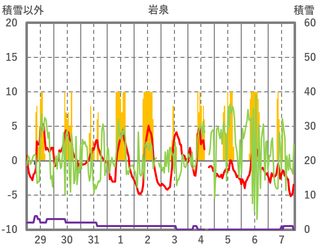 | 日 | 時 | 気温 | 降水 | 風向/風速 | 日照 | 積雪 | 降雪 |