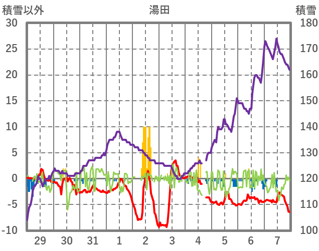 | 日 | 時 | 気温 | 降水 | 風向/風速 | 日照 | 積雪 | 降雪 |