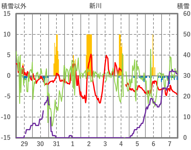 | 日 | 時 | 気温 | 降水 | 風向/風速 | 日照 | 積雪 | 降雪 |