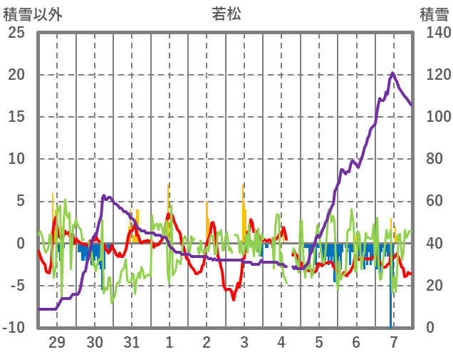 | 日 | 時 | 気温 | 降水 | 風向/風速 | 日照 | 積雪 | 降雪 |