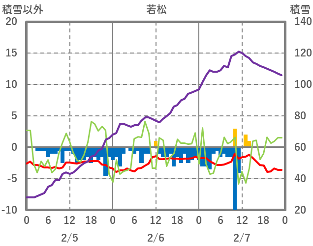 | 日 | 時 | 気温 | 降水 | 風向/風速 | 日照 | 積雪 | 降雪 |