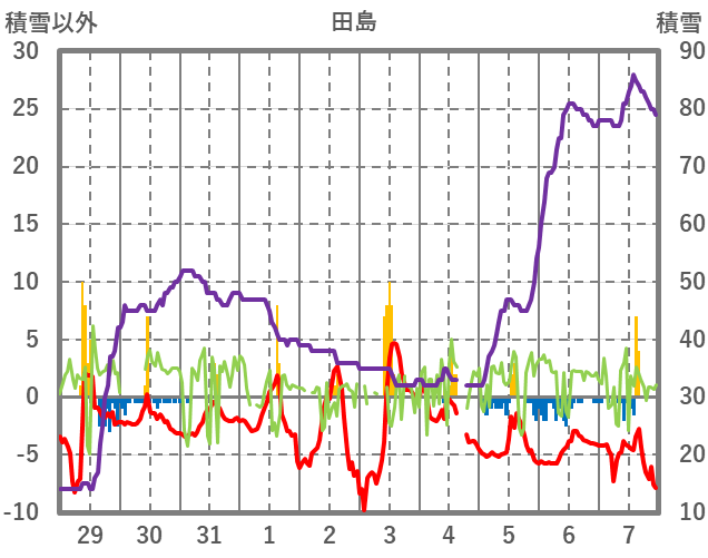 | 日 | 時 | 気温 | 降水 | 風向/風速 | 日照 | 積雪 | 降雪 |
