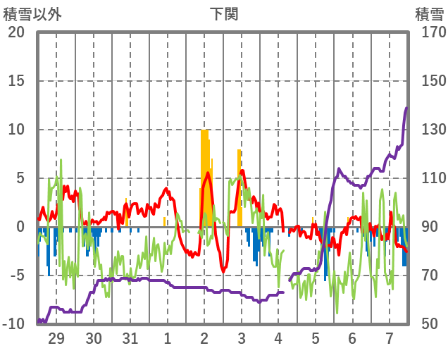 | 日 | 時 | 気温 | 降水 | 風向/風速 | 日照 | 積雪 | 降雪 |