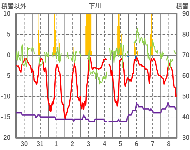 | 日 | 時 | 気温 | 降水 | 風向/風速 | 日照 | 積雪 | 降雪 |