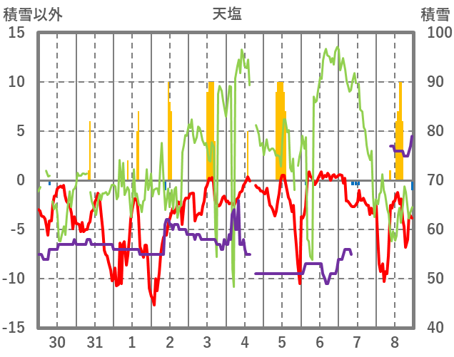 | 日 | 時 | 気温 | 降水 | 風向/風速 | 日照 | 積雪 | 降雪 |