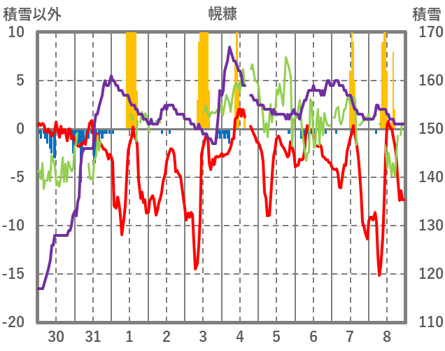 | 日 | 時 | 気温 | 降水 | 風向/風速 | 日照 | 積雪 | 降雪 |