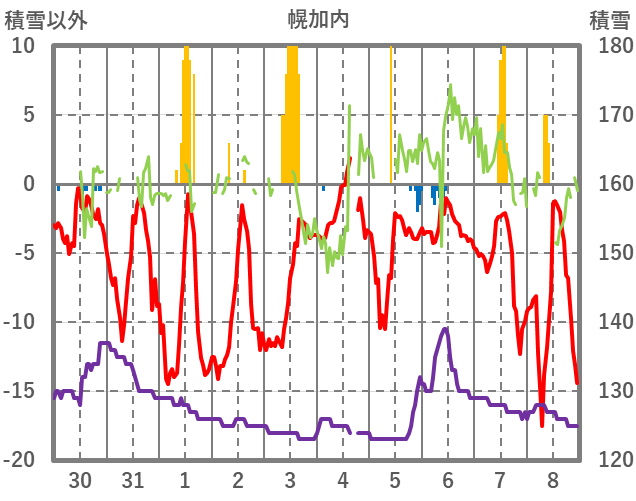 | 日 | 時 | 気温 | 降水 | 風向/風速 | 日照 | 積雪 | 降雪 |