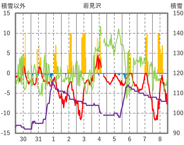 | 日 | 時 | 気温 | 降水 | 風向/風速 | 日照 | 積雪 | 降雪 |