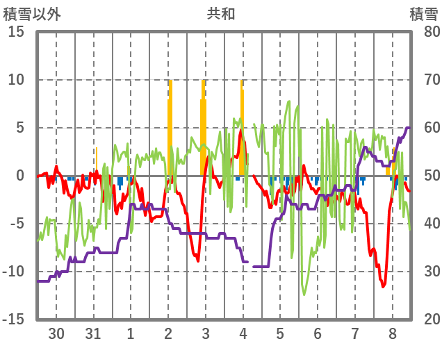 | 日 | 時 | 気温 | 降水 | 風向/風速 | 日照 | 積雪 | 降雪 |