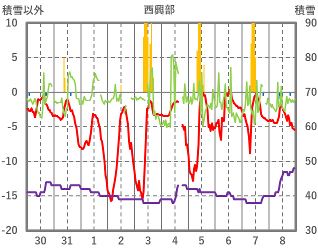 | 日 | 時 | 気温 | 降水 | 風向/風速 | 日照 | 積雪 | 降雪 |