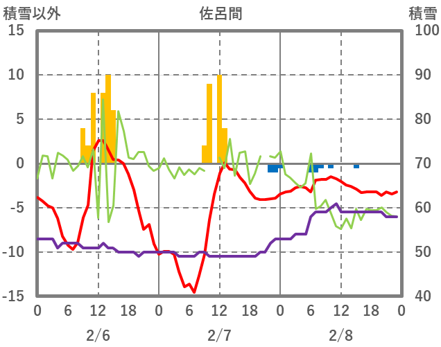 | 日 | 時 | 気温 | 降水 | 風向/風速 | 日照 | 積雪 | 降雪 |