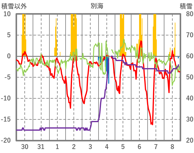 | 日 | 時 | 気温 | 降水 | 風向/風速 | 日照 | 積雪 | 降雪 |