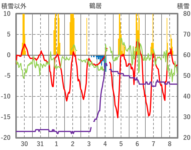 | 日 | 時 | 気温 | 降水 | 風向/風速 | 日照 | 積雪 | 降雪 |