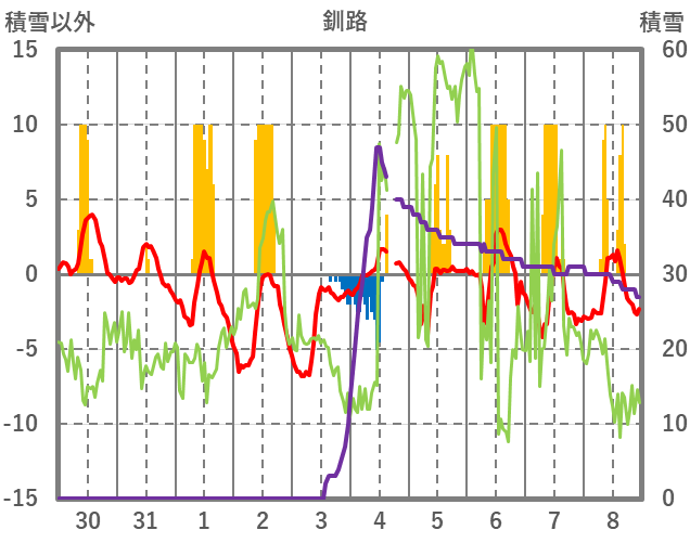 | 日 | 時 | 気温 | 降水 | 風向/風速 | 日照 | 積雪 | 降雪 |