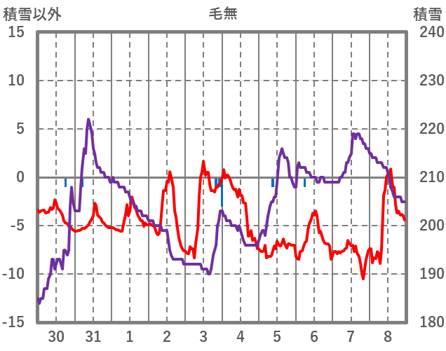 | 日 | 時 | 気温 | 降水 | 風向/風速 | 日照 | 積雪 | 降雪 |