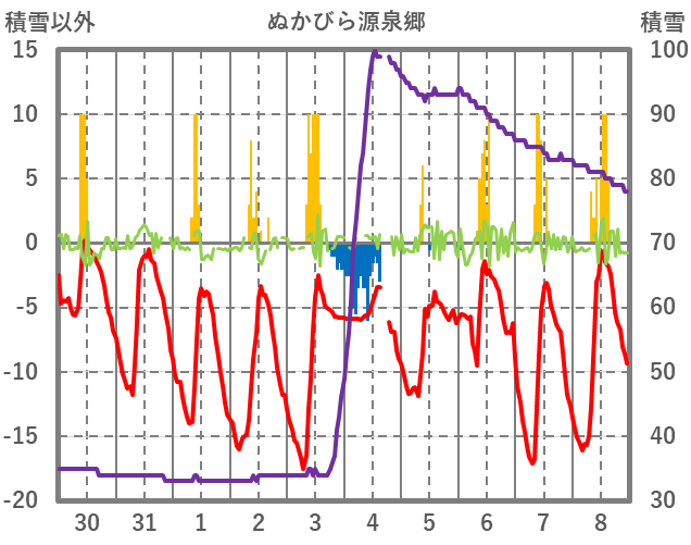 | 日 | 時 | 気温 | 降水 | 風向/風速 | 日照 | 積雪 | 降雪 |