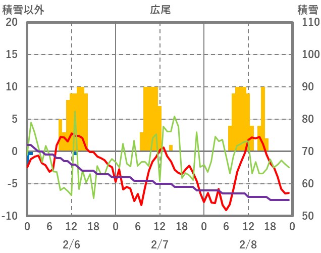 | 日 | 時 | 気温 | 降水 | 風向/風速 | 日照 | 積雪 | 降雪 |