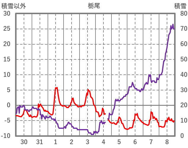 | 日 | 時 | 気温 | 降水 | 風向/風速 | 日照 | 積雪 | 降雪 |